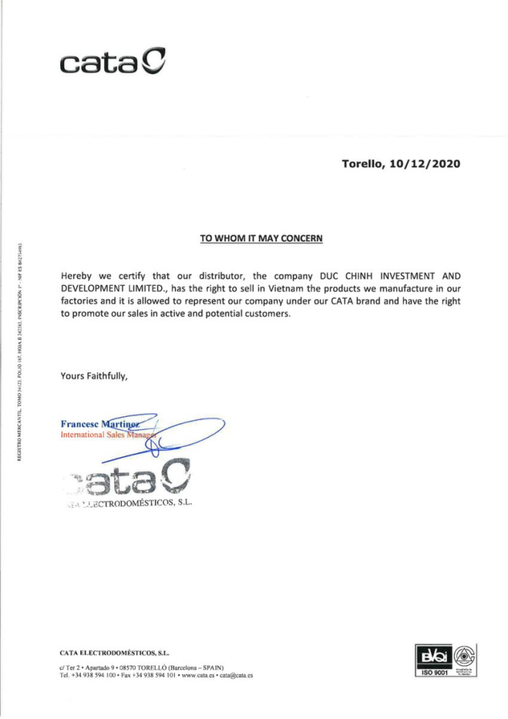 Khách hàng khi mua các sản phẩm Cata thông qua hệ thống Đức Chính sẽ hoàn toàn yên tâm về nguồn gốc xuất xứ (CO/CQ đầy đủ). Mọi sản phẩm đều được nhập khẩu nguyên chiếc, đảm bảo tiêu chuẩn khắt khe từ thị trường châu Âu.